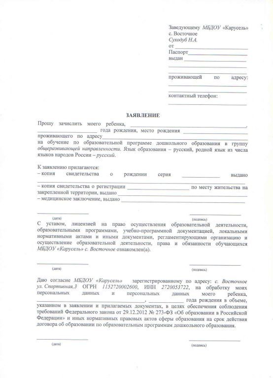 Примерная форма заявления о приеме в образовательную организацию